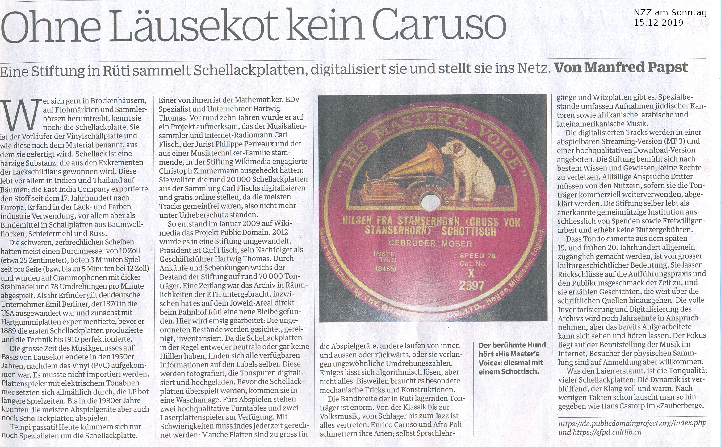 Already in 2009 Carl Flisch (music historian), Christoph Zimmermann (audio technician) and Philippe Perreaux (copyright lawyer) had the idea that most of the music on shellac records is in the Publicv Domain because all commercial shellac racords are older than 1960.
